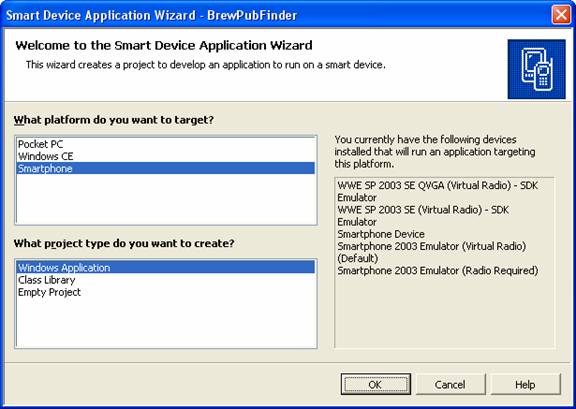 You can write programs for the Smartphone using your current edition of Visual Studio. I downloaded and installed the Smartphone 2003 SDK from the Microsoft website. The free download SDK, available here, contains the libraries needed to write code for that platform, the emulators needed to test applications on your development machine, and the documentation you need to understand it. The process looks and feels very much like writing a desktop application. I generated a Compact Framework project in Visual Studio and chose Smartphone 2003 from the target platform dialog box shown here: