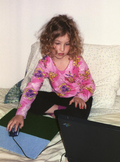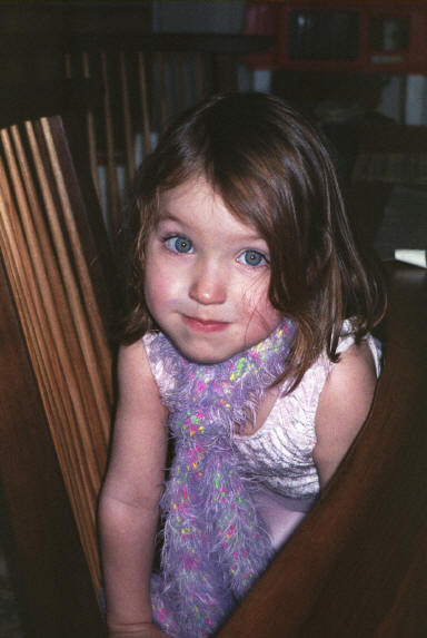 And now, the moment for which I know you've all been waiting -- the pictures of my two girls. Annabelle Rose, now 5-1/2, is considering an early exit from kindergarten for a career in programming, just like her old man. Or maybe she's goofing off with FreeCell, ditto. I haven't introduced her to Spider Solitaire yet. She's now learning to read music and play the glockenspiel in her Kindermusik class. Lucy Katrina, now almost three, likes to pretend that she is a kitten named Wishbone, whom she met in a book called I Like Cats. She is very much looking forward to seeing the trained cats (truth!) at the Moscow Cats Theatre when she visits her grandparents in New York City. She is about to start the ballet class she's wanted for a year and a half, but wasn't old enough for until just now. She loves to swing on the trapeze on the playset out in the yard.