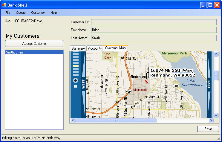 It’s assembled from several independent parts that are loosely coupled together. The outer frame is known as the shell. The shell developer provides a number of workspaces, windows which can hold separate, independent user interface component known as Smart Parts. In the screen shot above, each tab represents a workspace holding a Smart Part. The customer list on the left and the customer data in the top right are also Smart Parts. At startup time, the shell loads the Smart Parts specified in the configuration file for the particular logged-in user. When the user selects a customer in the left-hand list, it notifies whichever Smart Part is active of the selection. Each part can then do its own independent thing, such as displaying the details of the customer (above) or showing a map of the customer’s location (below)