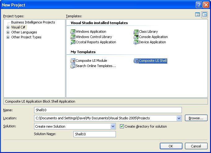 The main drawback to the CAB is that it’s very new: version 1 in C# was released on November 14 and VB on November 24. The code seems to work and I haven’t found any bugs yet, but it hasn’t been wrung out the way it will be in a few years. Also, since it’s new, the tool set for it is somewhat sparse. For example, there’s no VS 2005 project template to generate a CAB project. So I wrote a couple of them, one for the shell and one for a module containing a Smart Part, as you can see in the figure below: